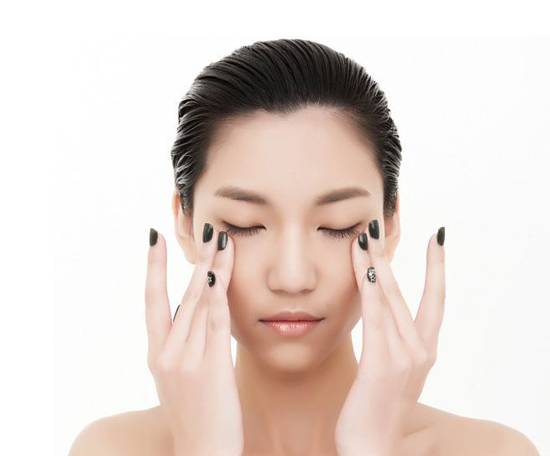 眼霜涂抹手法1:伸出双手的中指和无名指,分别轻放上下眼皮,由靠近鼻梁的鼻头处轻轻滑到太阳穴,如此重复三次。